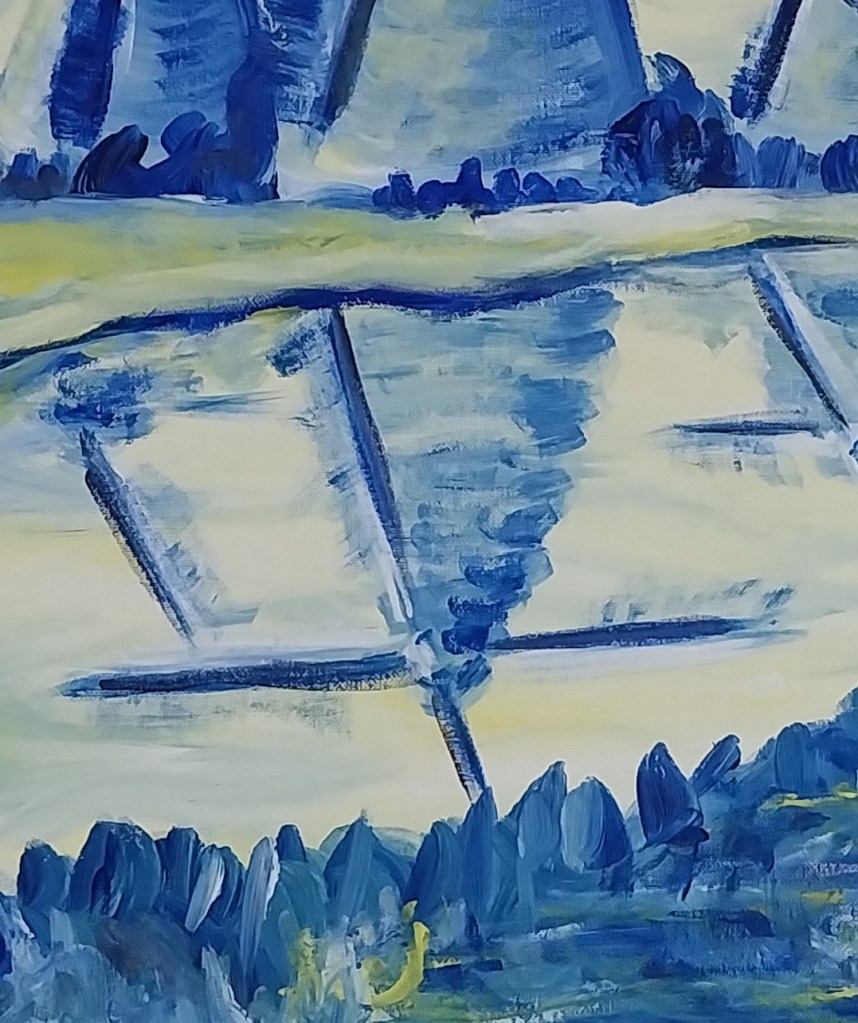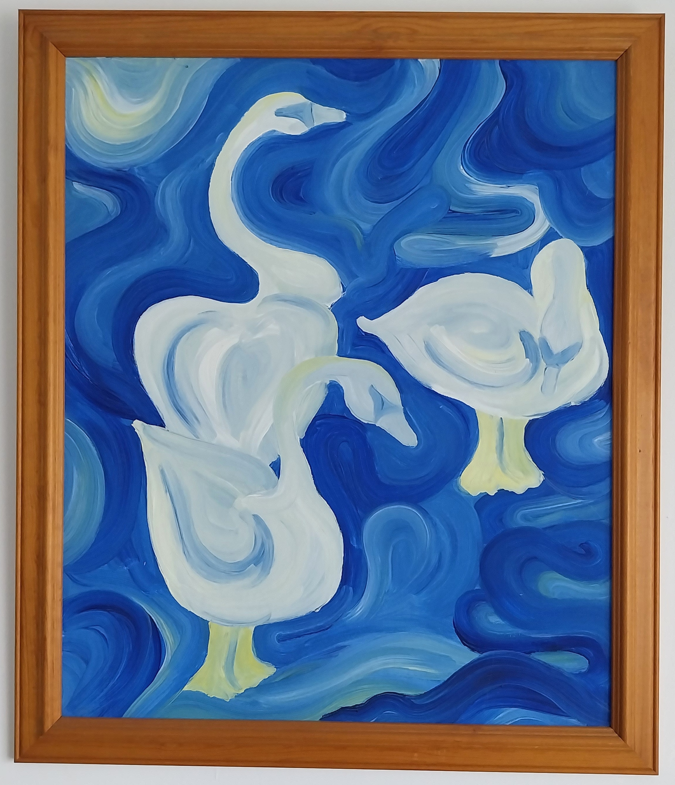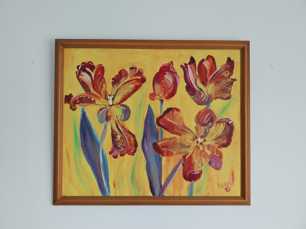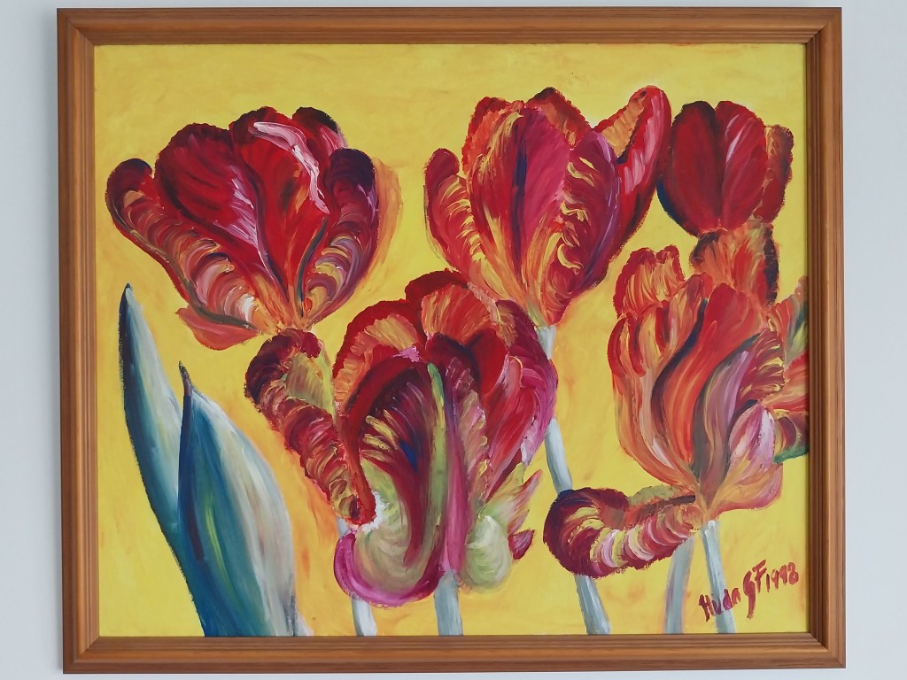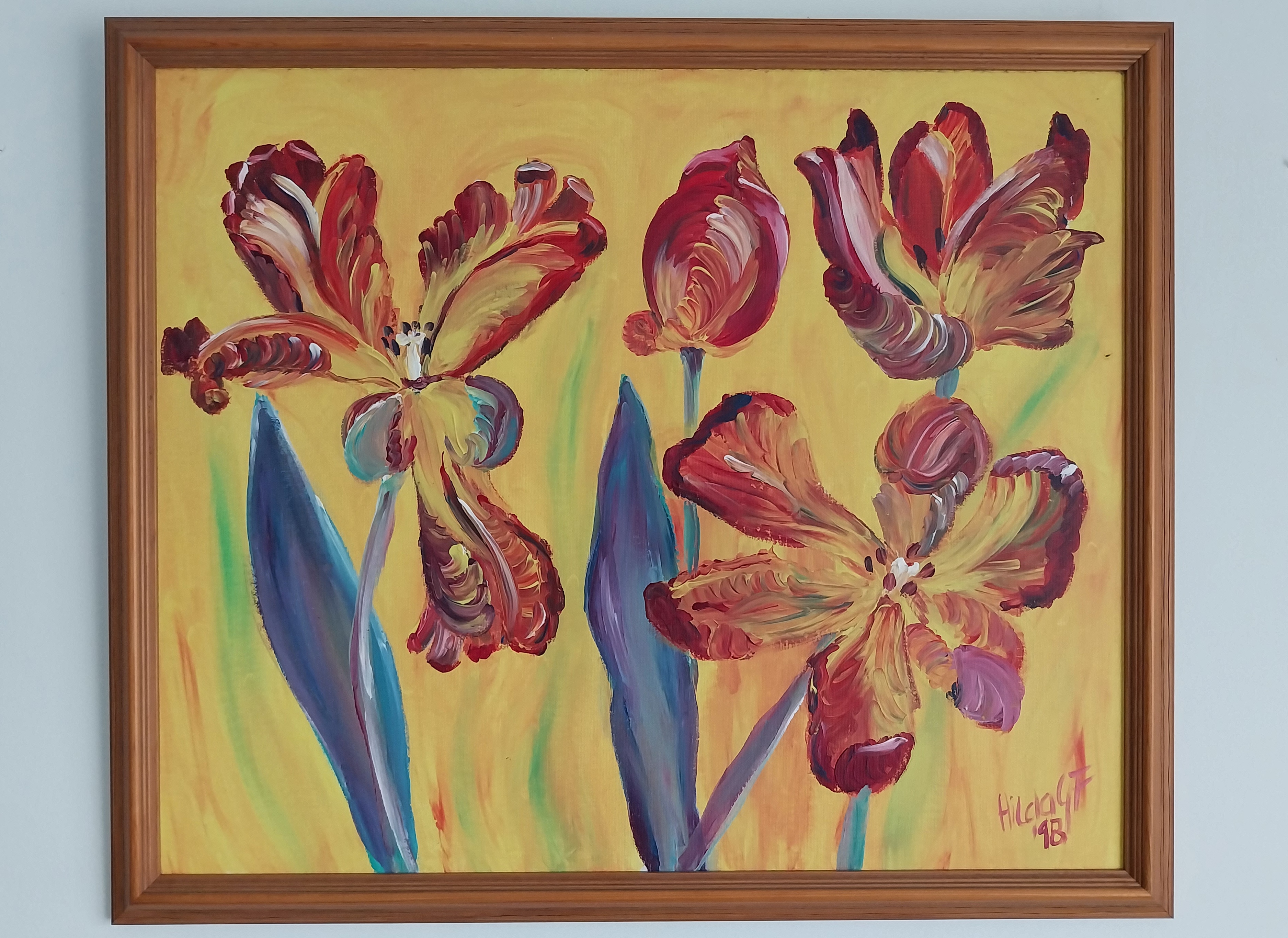 Larger paintings characterised the earlier part of Hilda’s career, acrylic on canvas board and simply framed with wood. The subjects were influenced by time spent in Northern Europe.